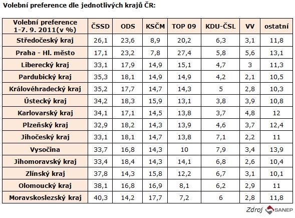 Ve Středočeském kraji, kterému podle pravidelných průzkumů oblíbenosti hejtmanů společnosti SANEP, vládne jeden z nejméně oblíbených hejtmanů David Rath, vítězí v hypotetických volbách do Poslanecké sněmovny (nelze zaměňovat s krajskými volbami) se ziskem 26,1% ČSSD, která stejně jako v minulém sledovaném období zaznamenává ztrátu. Sociální demokraté by tak v září tohoto roku obdrželi o 0,5 procentního bodu méně než v letošním červenci. Na druhém místě se umístila ODS (23,6%), jež by na pozici druhé nejsilnější pravicové strany tohoto kraje vystřídala TOP 09 (20,2%). TOP 09 pak ve srovnání s minulým sledovaným obdobím ztrácí 3,9%. Čtvrtá příčka náleží dle aktuálních výsledků společnosti SANEP KSČM (8,9%). Poslední stranou, která by v letošním září dokázala překročit volební práh, jsou lidovci (6,3%). Nejmenší vládní strana Věci veřejné by získala 3,1%, což je o 0,1 procentního bodu méně než v minulém sledovaném období.